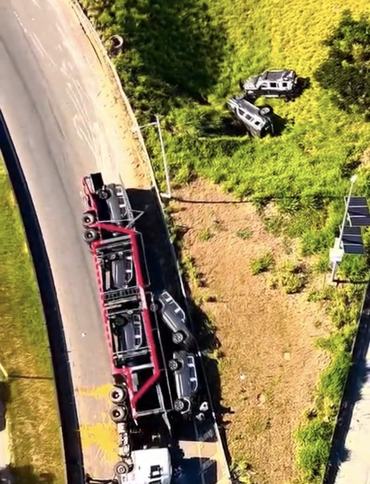 Alguns dos veículos transportados se soltaram da plataforma após o tombamento e caíram em um barranco, mas felizmente não há, até o momento, registro de outras pessoas feridas no acidente.
