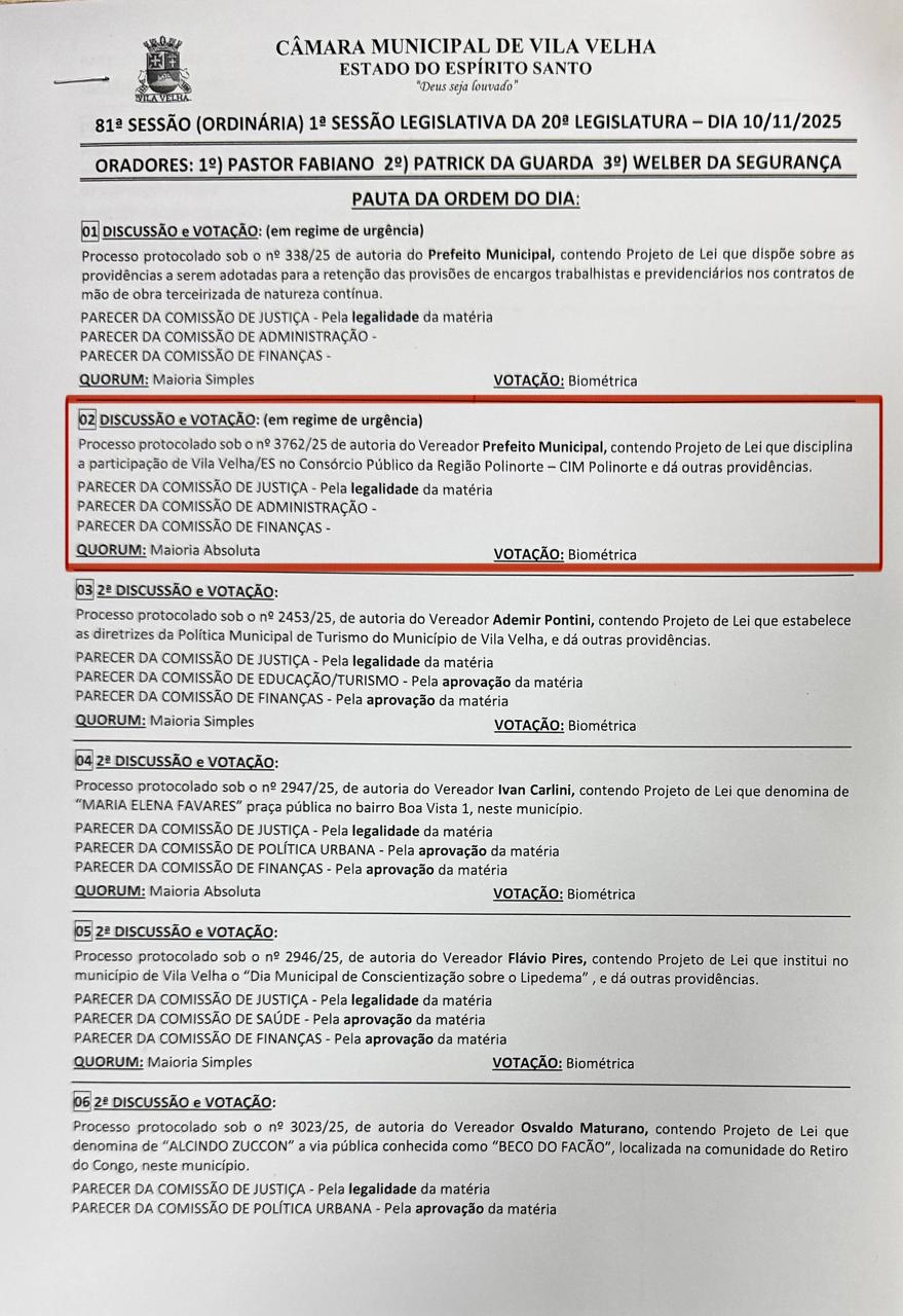 A Câmara Municipal de Vila Velha deve votar nesta segunda-feira (10) o projeto que autoriza o município a aderir ao Consórcio Público da Região Polinorte (CIM Polinorte) — o mesmo consórcio cuja ata de registro de preços foi suspensa na última semana pelo Tribunal de Contas do Espírito Santo (TCE-ES).