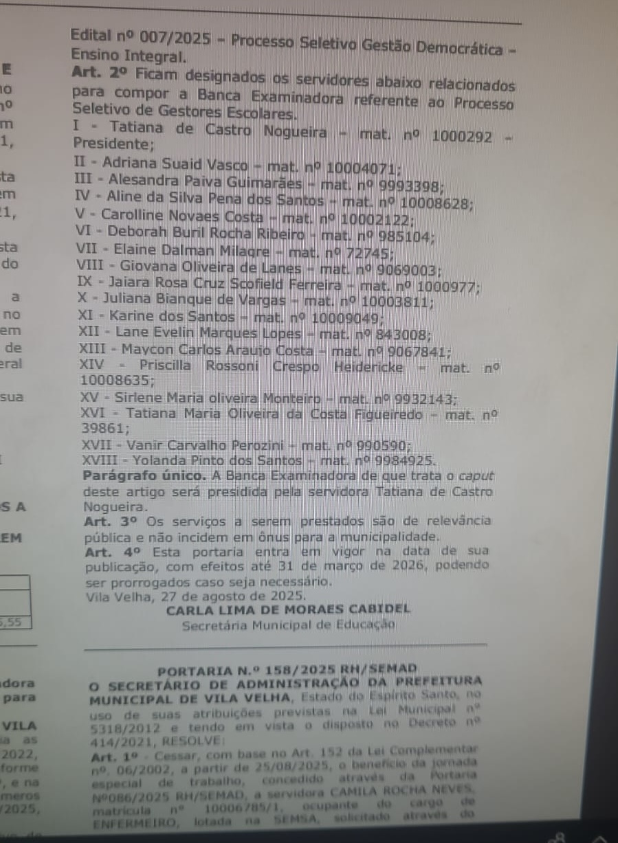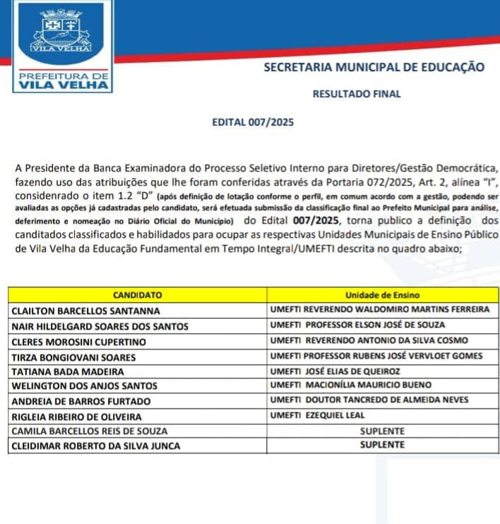 A reportagem procurou a Secretaria Municipal de Educação de Vila Velha, mas não obteve retorno até o fechamento desta matéria. O espaço segue aberto para manifestação da SEMED e da Prefeitura.