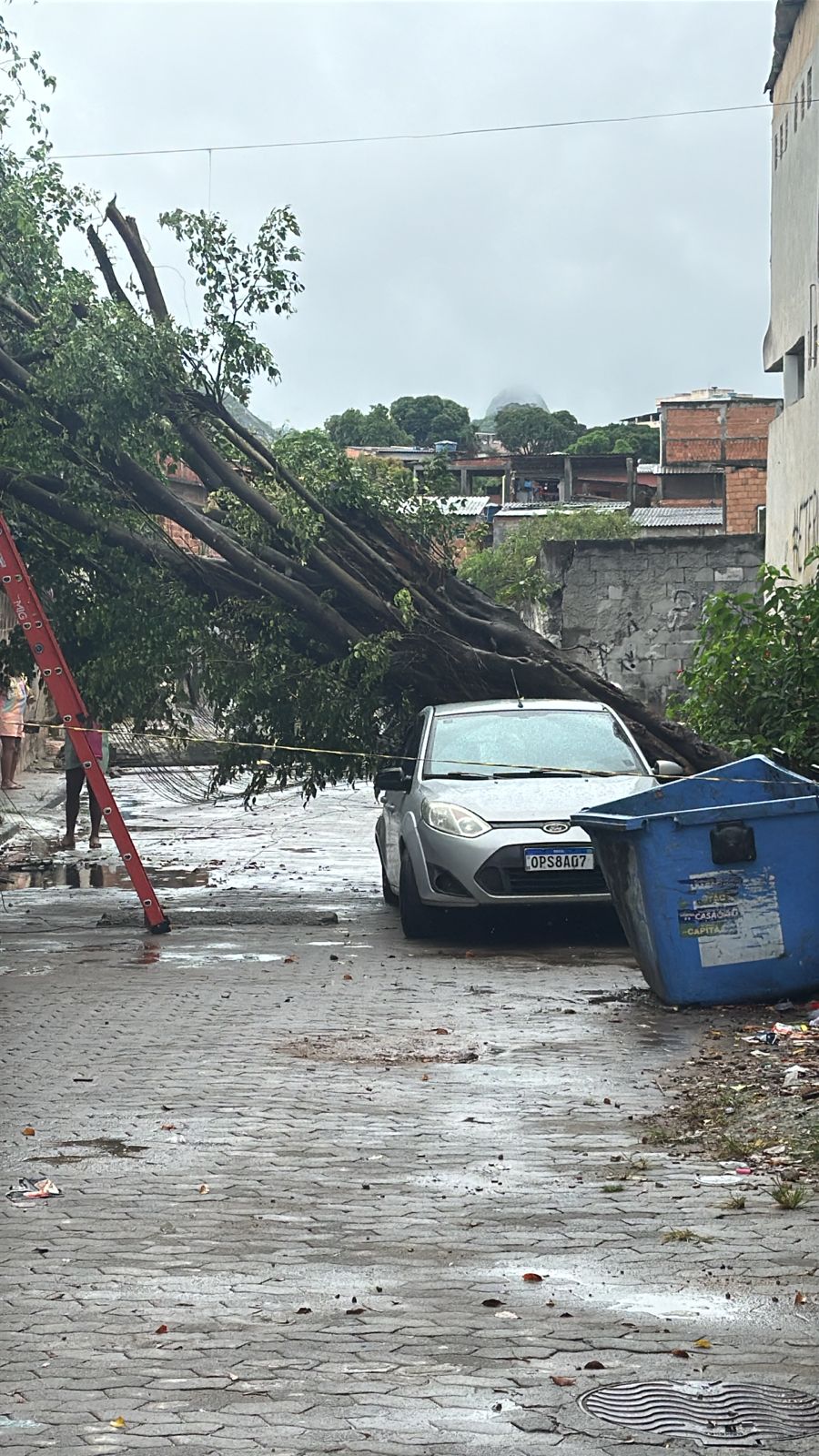Outro ponto crítico foi a queda de uma árvore de grande porte, que acabou atingindo um veículo estacionado. Apesar do susto, não houve registro de feridos, mas o carro sofreu danos significativos. A via precisou ser parcialmente interditada até a remoção da árvore, dificultando ainda mais o tráfego local.